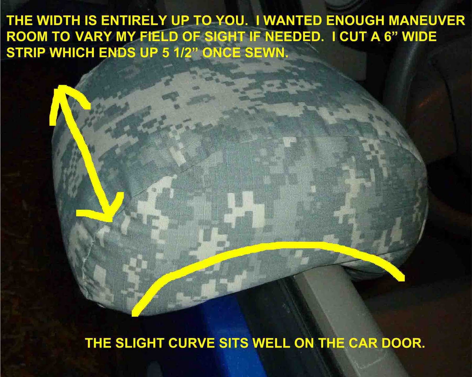 I began with sitting in the car and going through a range of motion to determine what size I needed. I folded an 11x17 piece of paper in half, drew out the basic design and cut while folded to ensure both sides were the same. After sewing however, I think a little additional in the arch would have been better. From testing several designs, curves no sharper than the outside radius of a CD will ensure easy sewing.Pin the pattern on fabric and cut two. These are your sides. Next determine how wide of a support you need. Your call for your needs. Remember to figure in your seem allowance. If you sew with 1/2 inch seams, add an inch to what you want your final width to be. Cut a strip of fabric the width you want making sure you have enough to go all around. If you can find a wide rip-stop fabric, all the better. It is tough and will take abuse yet easy to sew. Denim would also be good but not really a heavy canvas.